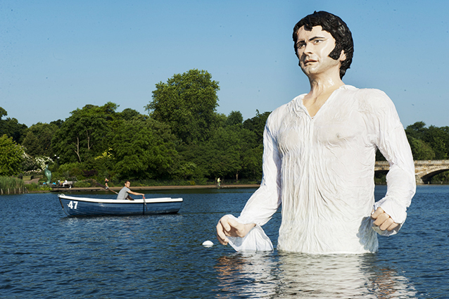 Recently, the ten most memorable moments of British TV were voted on, and Colin Firth coming out of the lake in Pride and Prejudice won most memorable. To commemorate, a huge statue of Colin Firth has been sculpted and has apparently been making the rounds to various lakes in Britain.